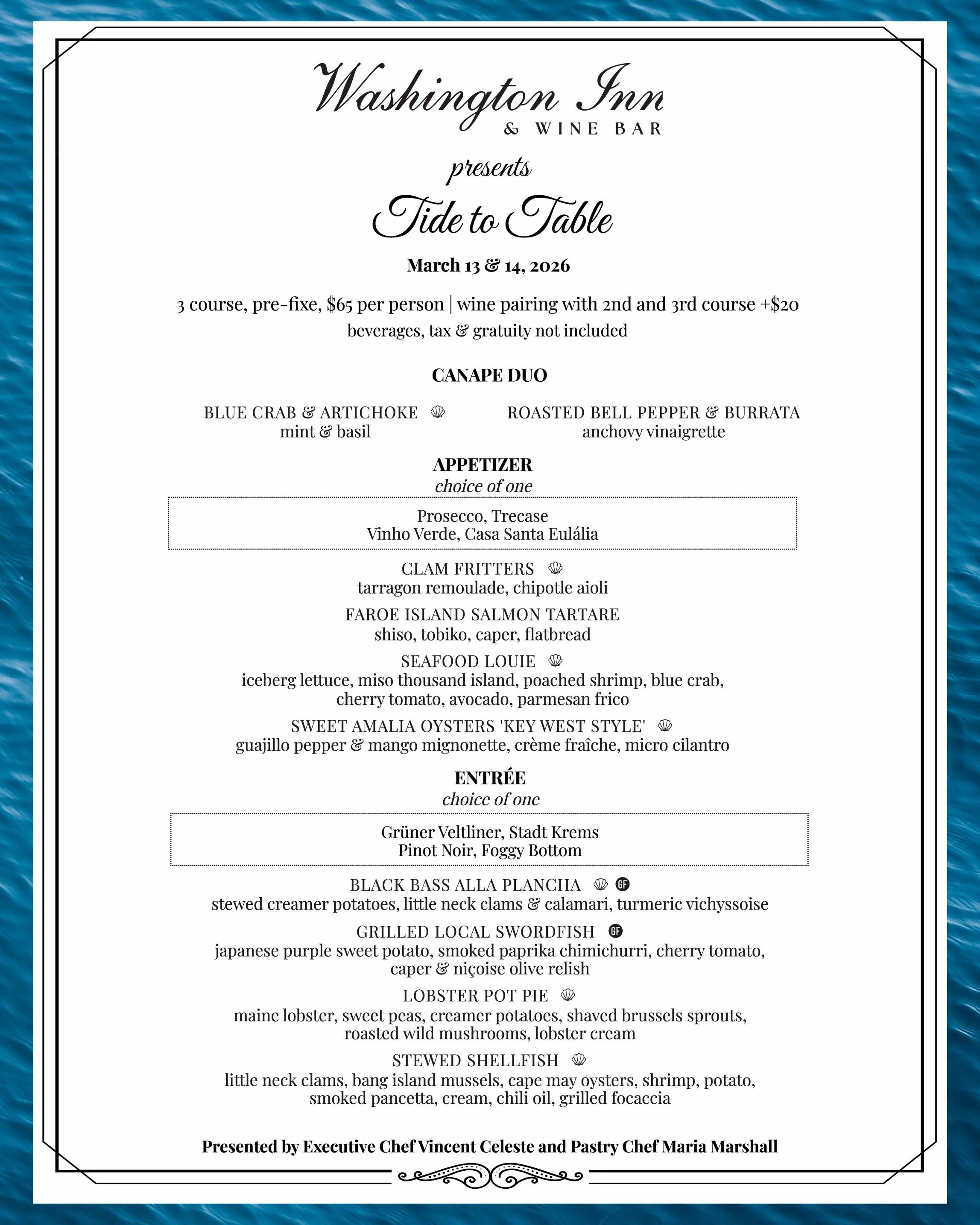 On March 13 and March 14, 2026, Washington Inn & Wine Bar invites you to experience Tide to Table, a special pre-fixe menu inspired by the rhythms and richness of the sea that surrounds us here in Cape May.